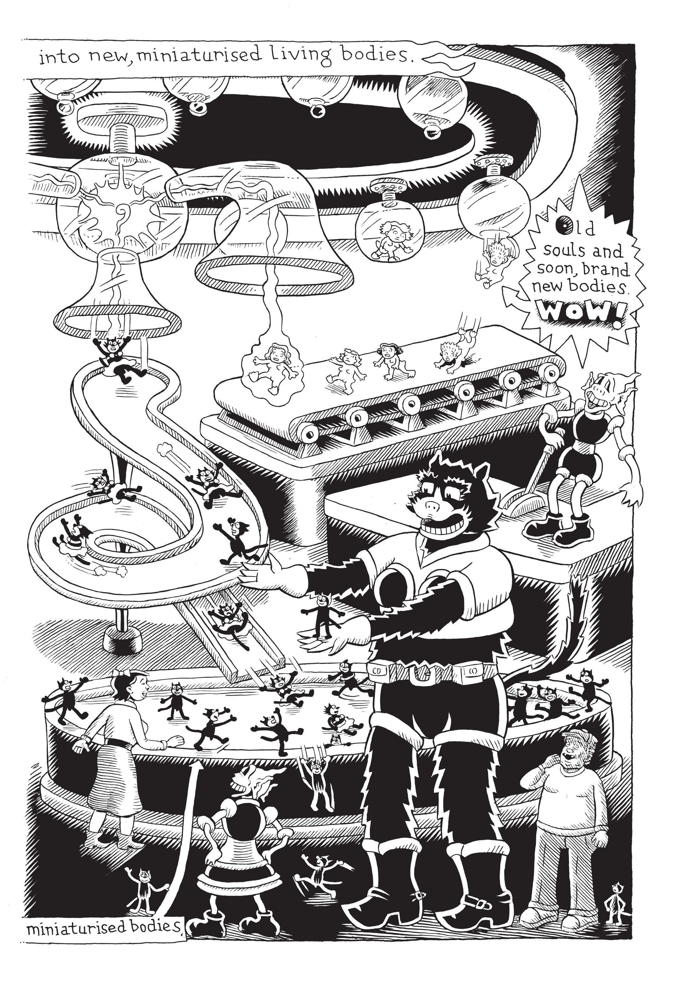 How I Make Comics is not just about how Kim Deitch makes comics, but about how comics made him. The book pinwheels between real autobiography and imagined comics history, but it begins in 1952 with a true story of eight-year-old Kim Deitch appearing in the audience of the Howdy Doody Show with eight-year-old Donnie Trump. Following Donnie's attempt to rig an election among the audience (no kidding!), Deitch relates a famous newspaper account of a diminutive wife who valiantly defends her equally diminutive husband in court, who just happens to be the inspiration of Harold Gray's Little Orphan Annie. Periodically, Kim asks his own wife for her critique and advice of the stories he's told so far, which he takes into account for future tales that include revenge-driven circus performers, fairytale mural painters, sordid comic book lore, comics readers creating real-life superheroes, impossibly old cats issuing supernatural judgments and inhabiting the bodies of humans, culminating in the real-life story of Kim's mother hitchhiking across country and being picked up by none other than Forrest J. Ackerman, the sci-fi, fantasy, and monster aficionado, who takes her to a convention where she meets a teenaged Ray Bradbury.