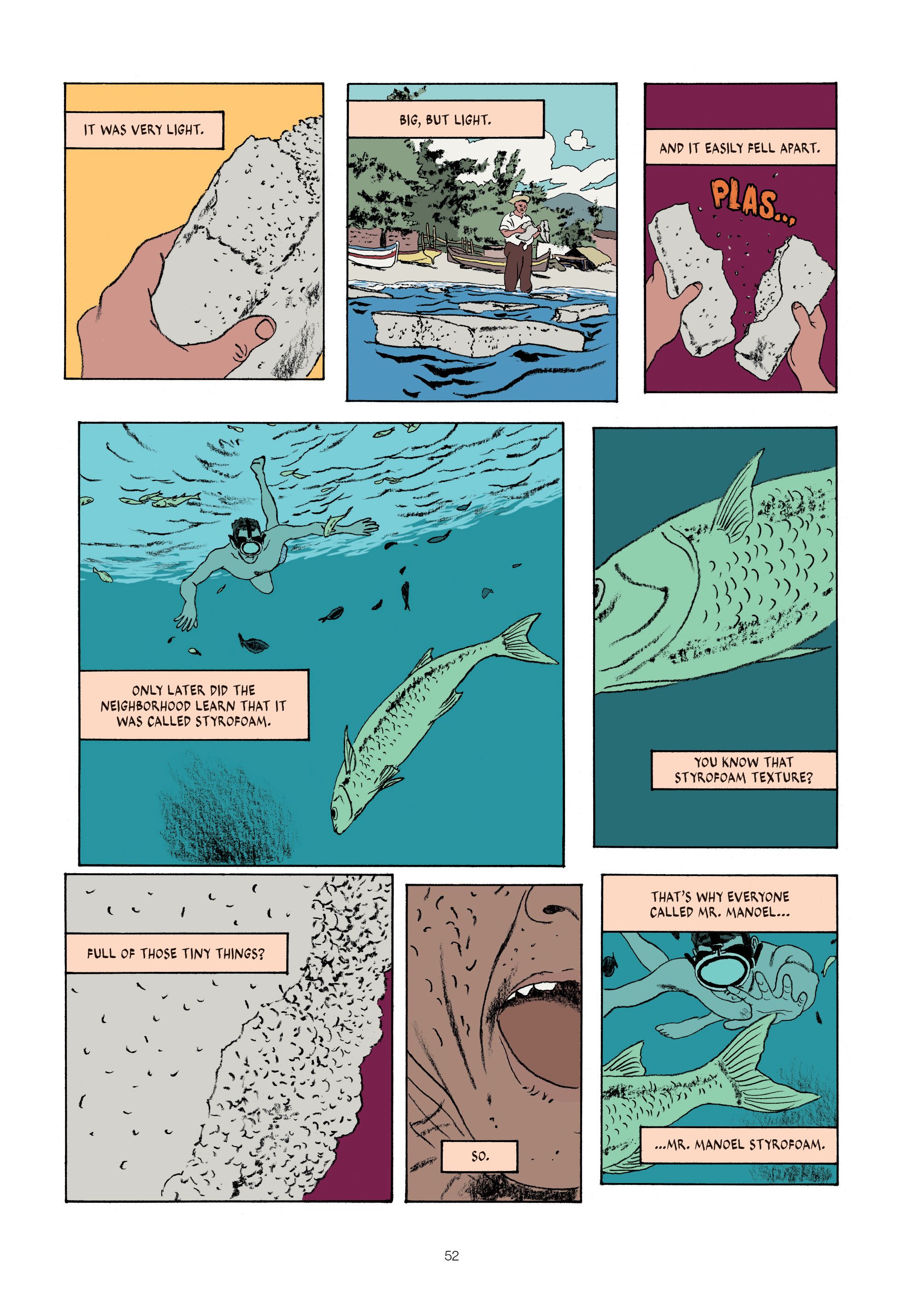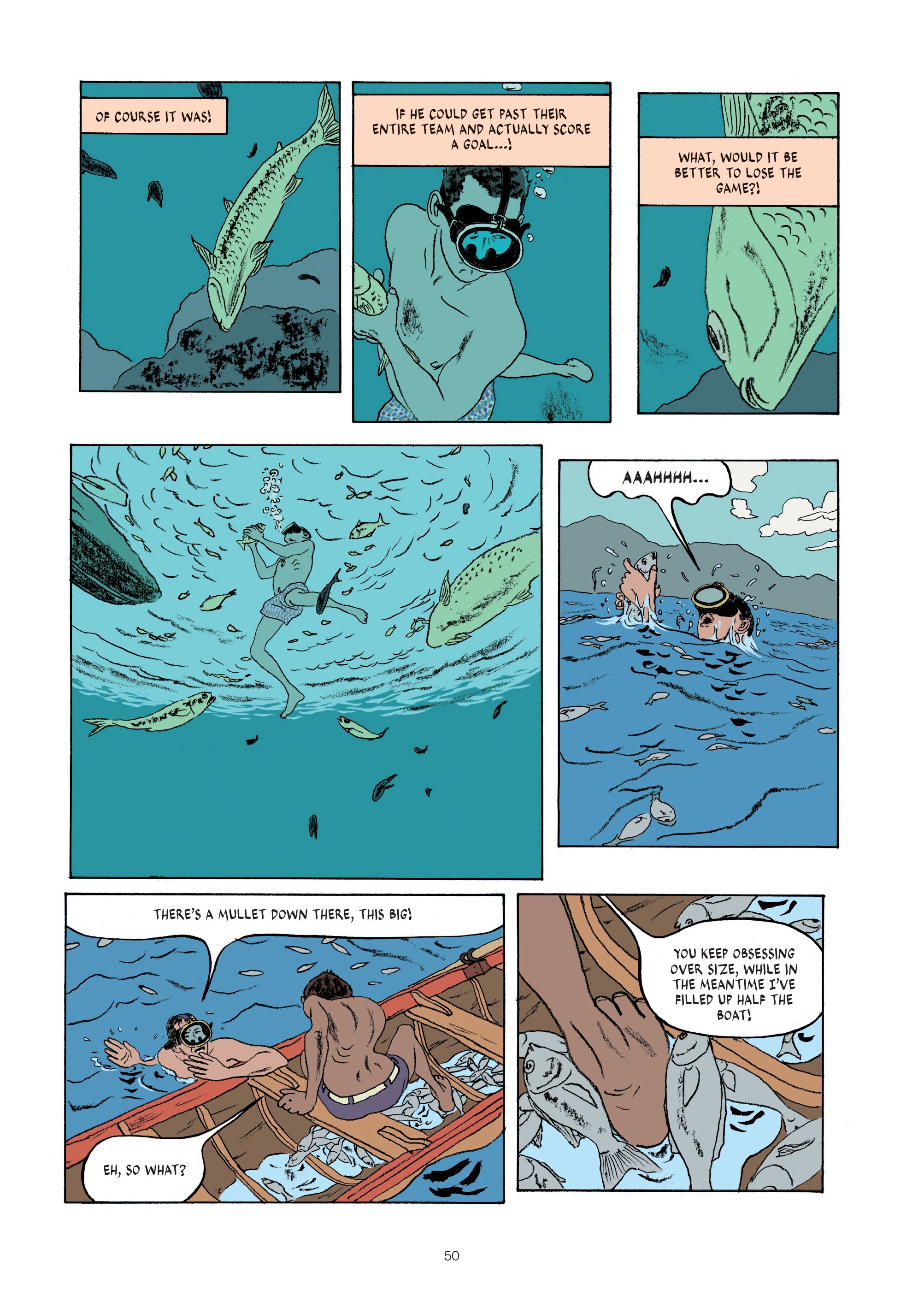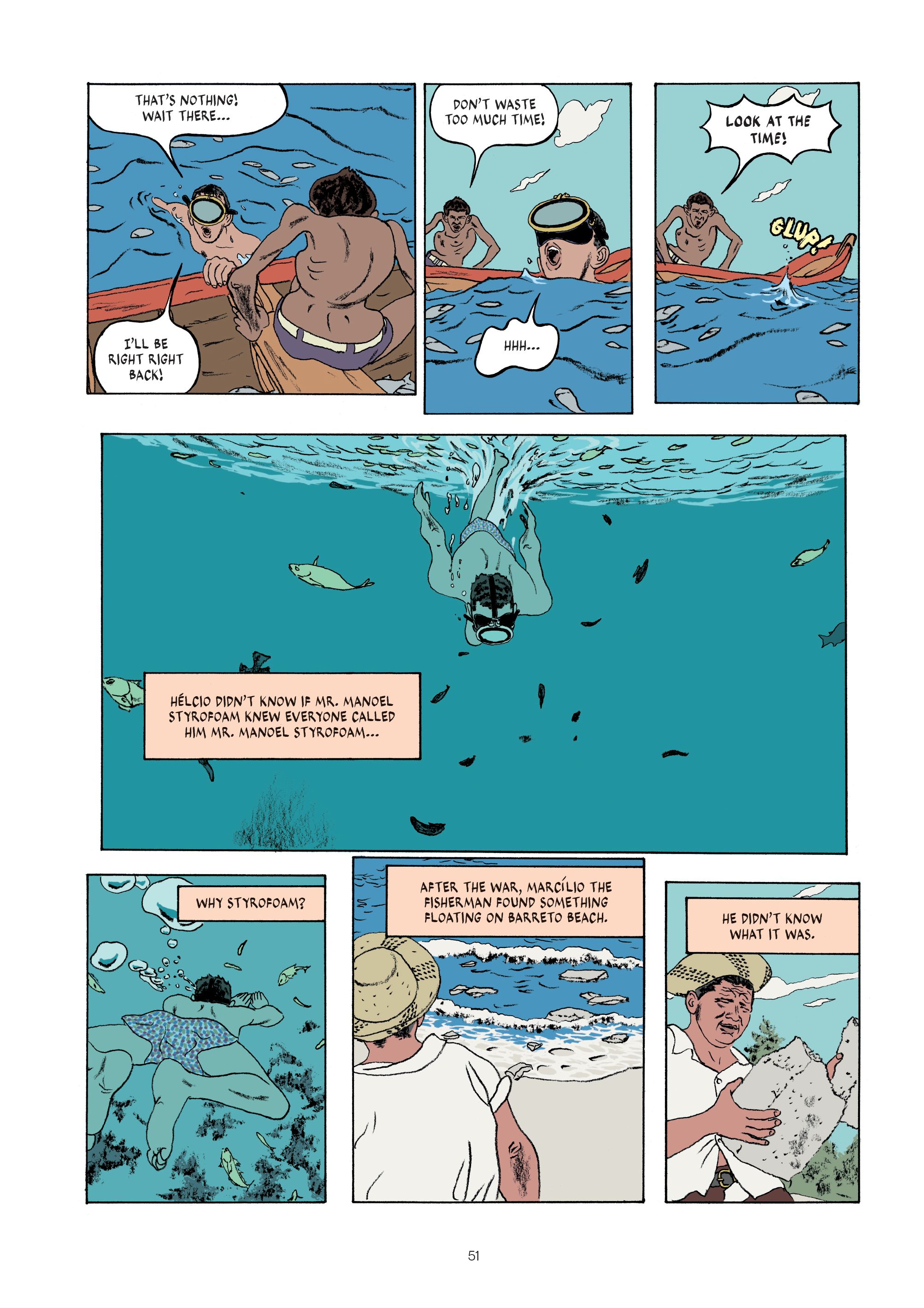 In 1950s Brazil, somewhere by the beach, not far from Rio, Hélcio, a young and promising soccer player, and his friend Noël, spot someone fishing with dynamite. They decide to take a boat and steal some of the dead fish to make some money. The boat trip turns into a perilous journey as the two thieves embark on an adventure that will challenge their friendship. Inspired by the life of Marcello Quintanilha's father, Hélcio Quintanilha, this graphic novel is both a suspenseful thriller and a breathtaking story about friendship.