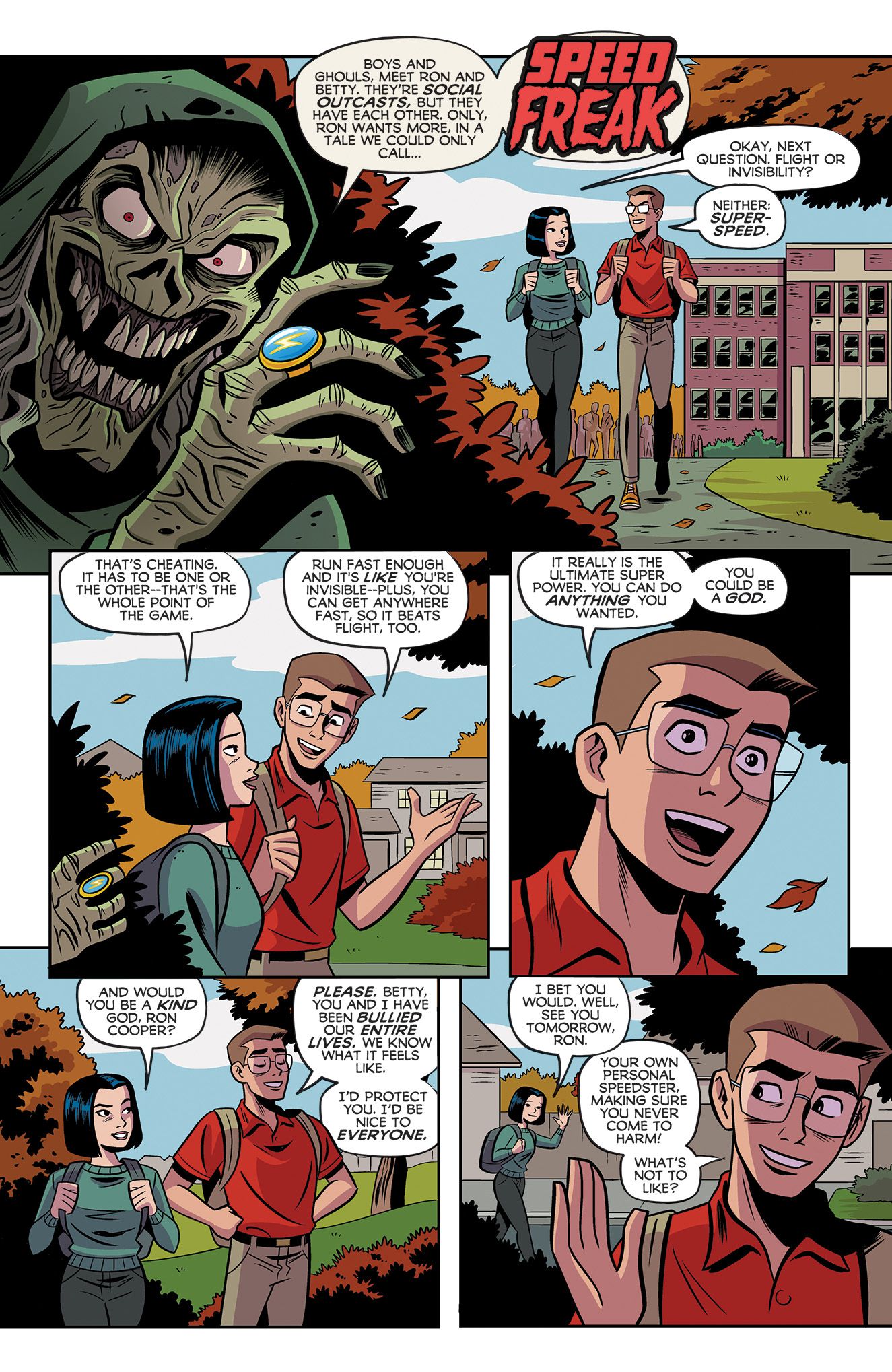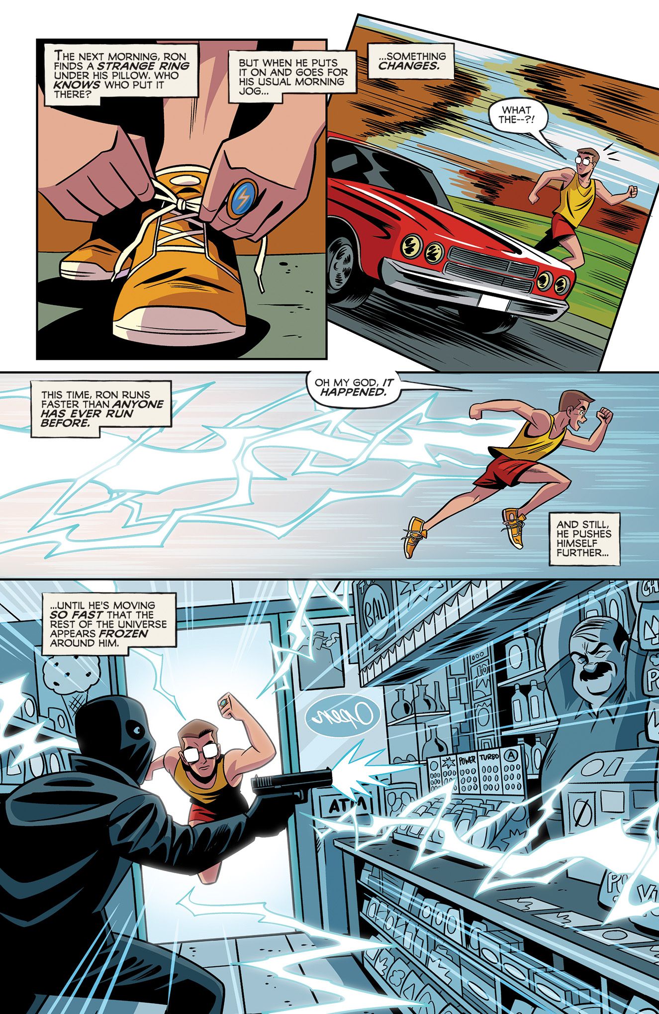Ryan North: I think most super powers, if considered through the right lens, can be horrific. At their core, their origin is usually things that happen to you (rather than things you choose) and there are so many things that happen to you that are maybe not the greatest. And the idea of being stuck at speed – the world frozen while you alone can never talk to another person again – felt like it resonated.